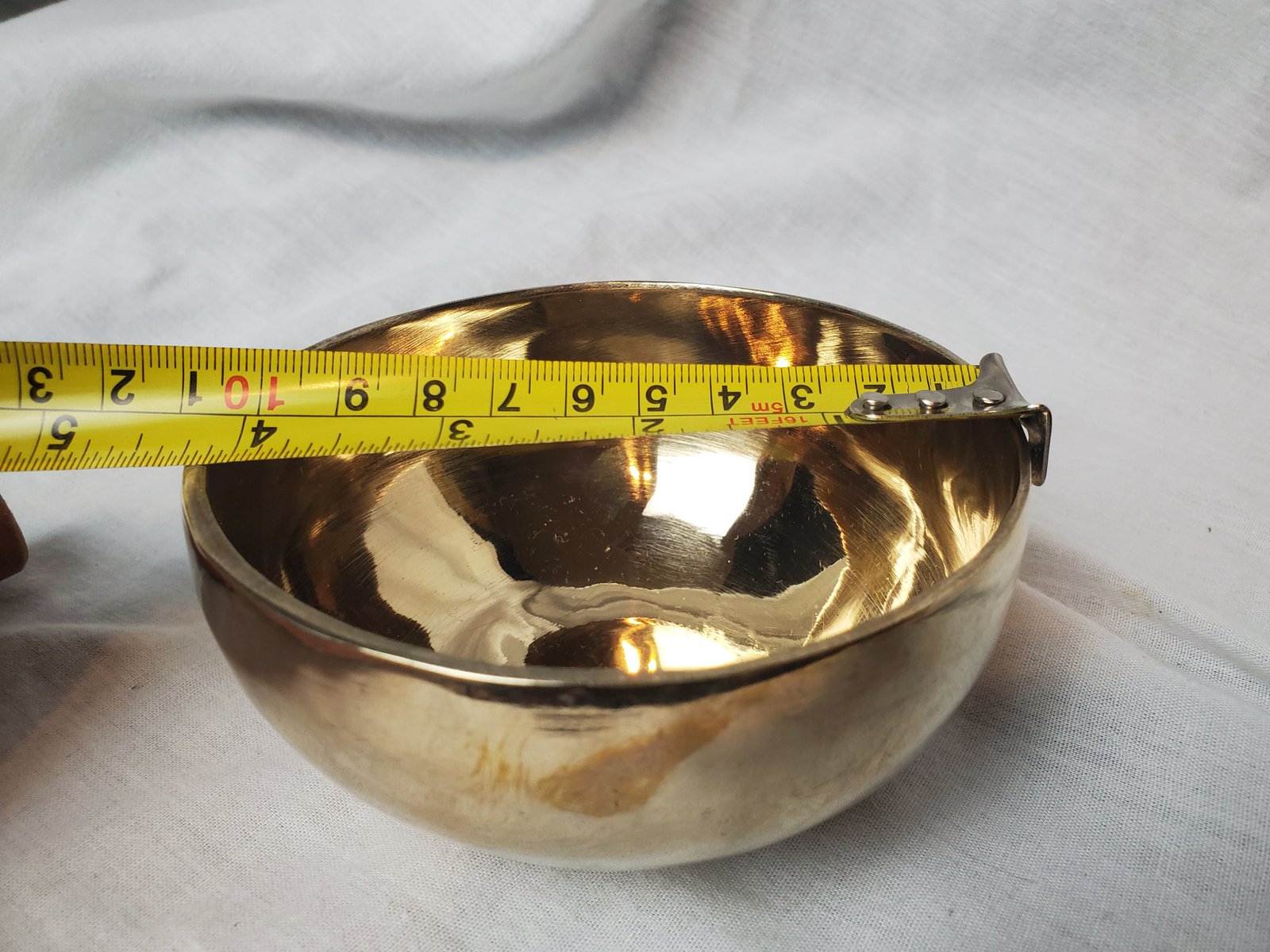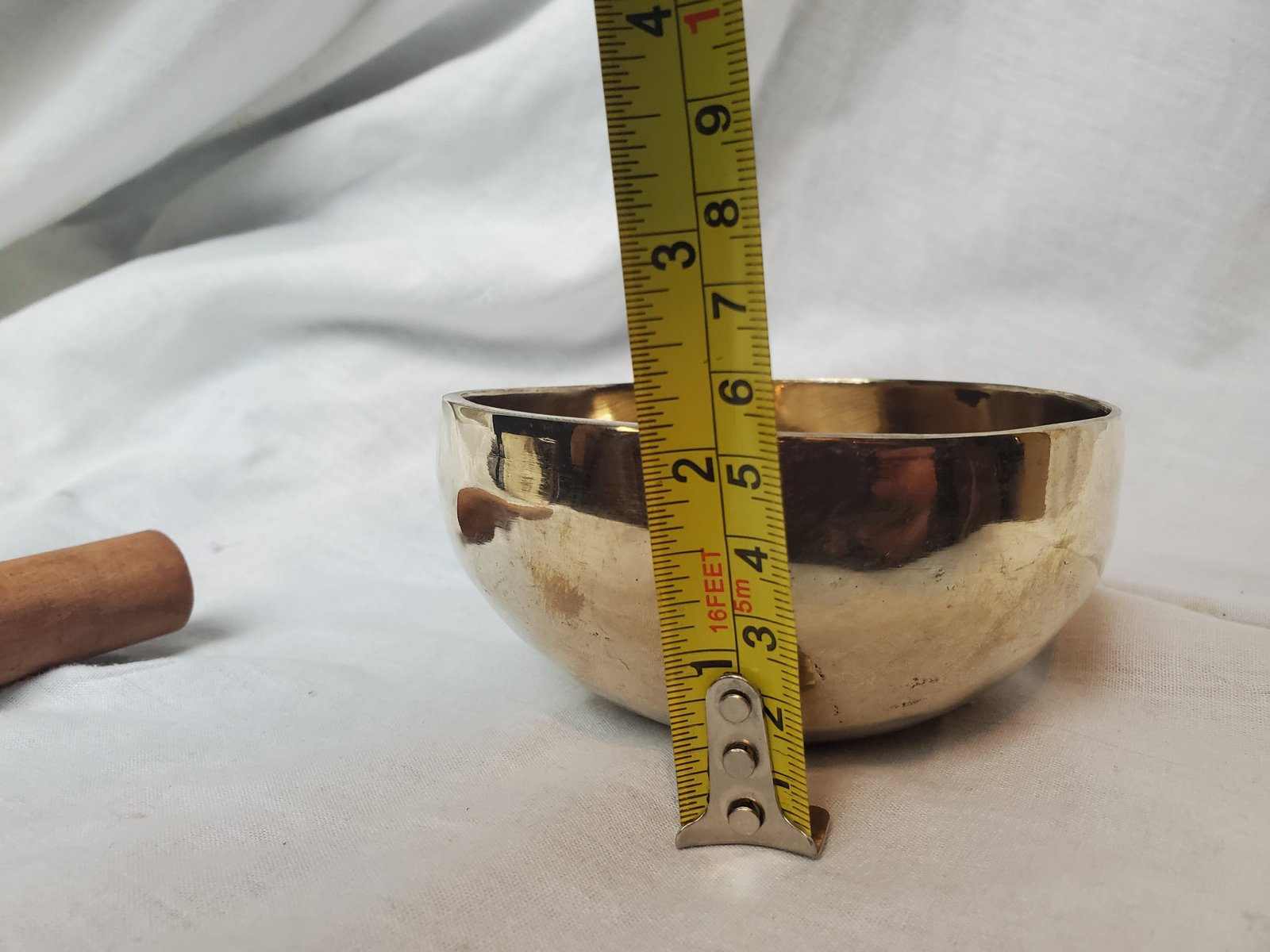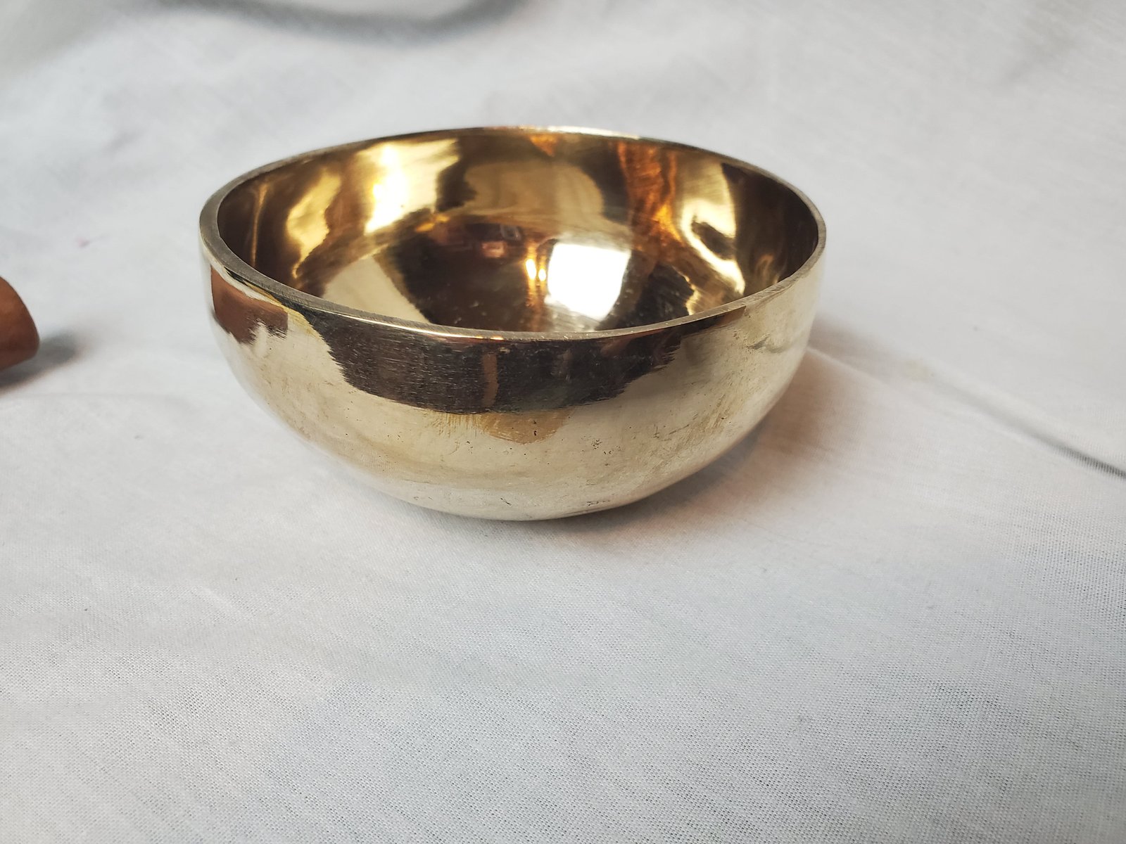 This hand hammered brass singing bowl has a bright and resonate tone. This shiny bowls are constructed traditionally by hand hammering.